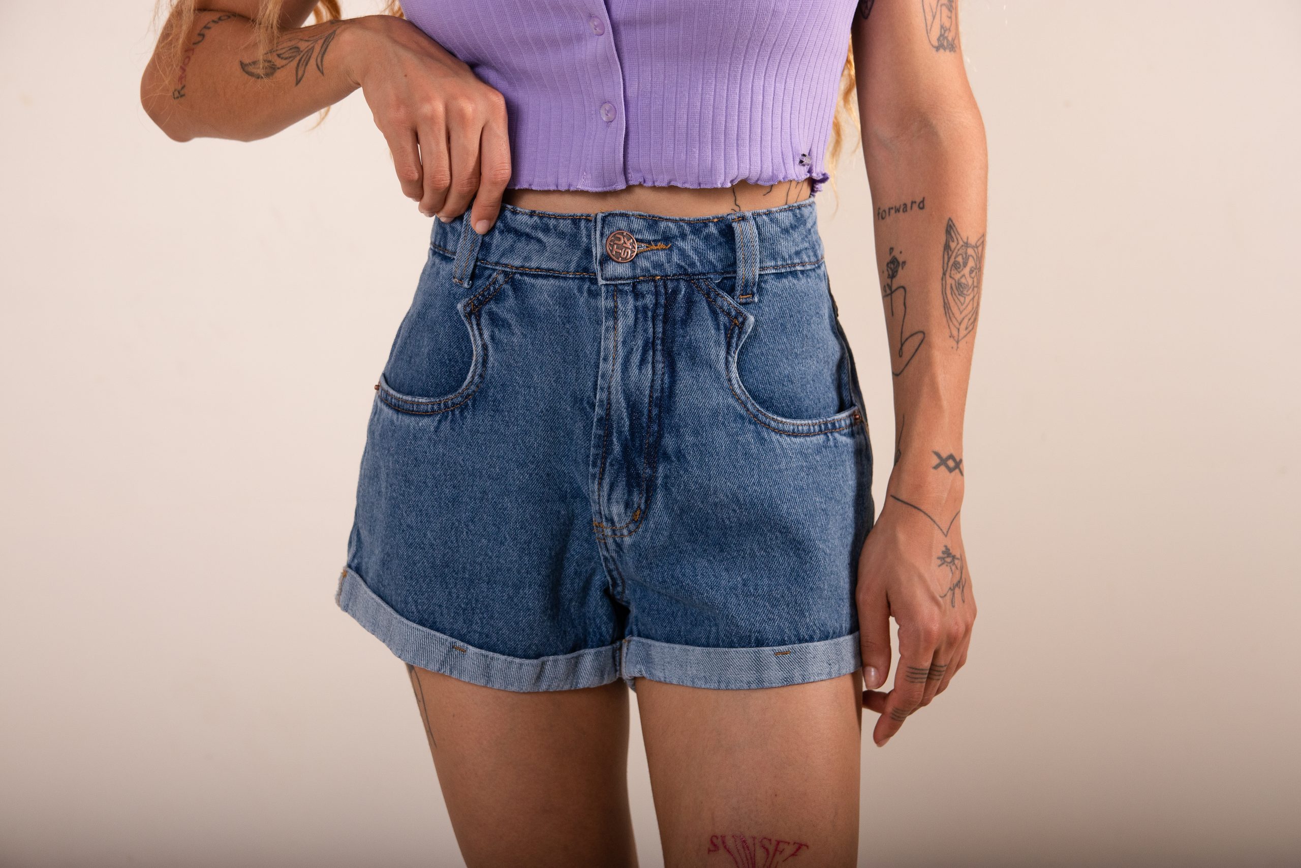 Short com lavagem marmorizado, barra dobrada e detalhe no bolso da frente.