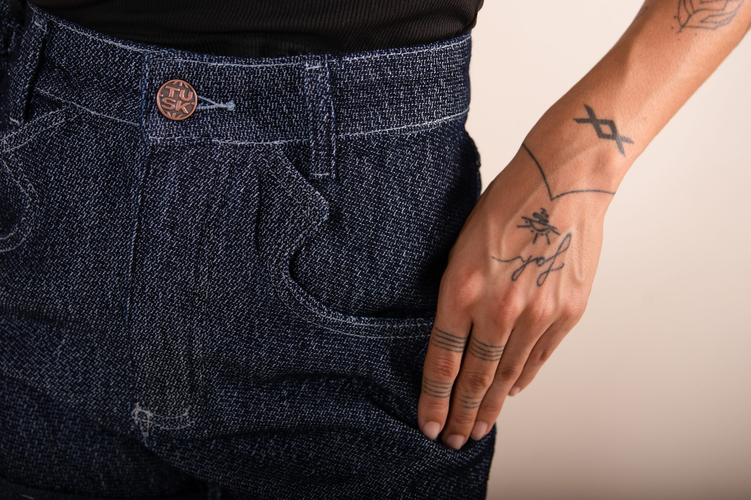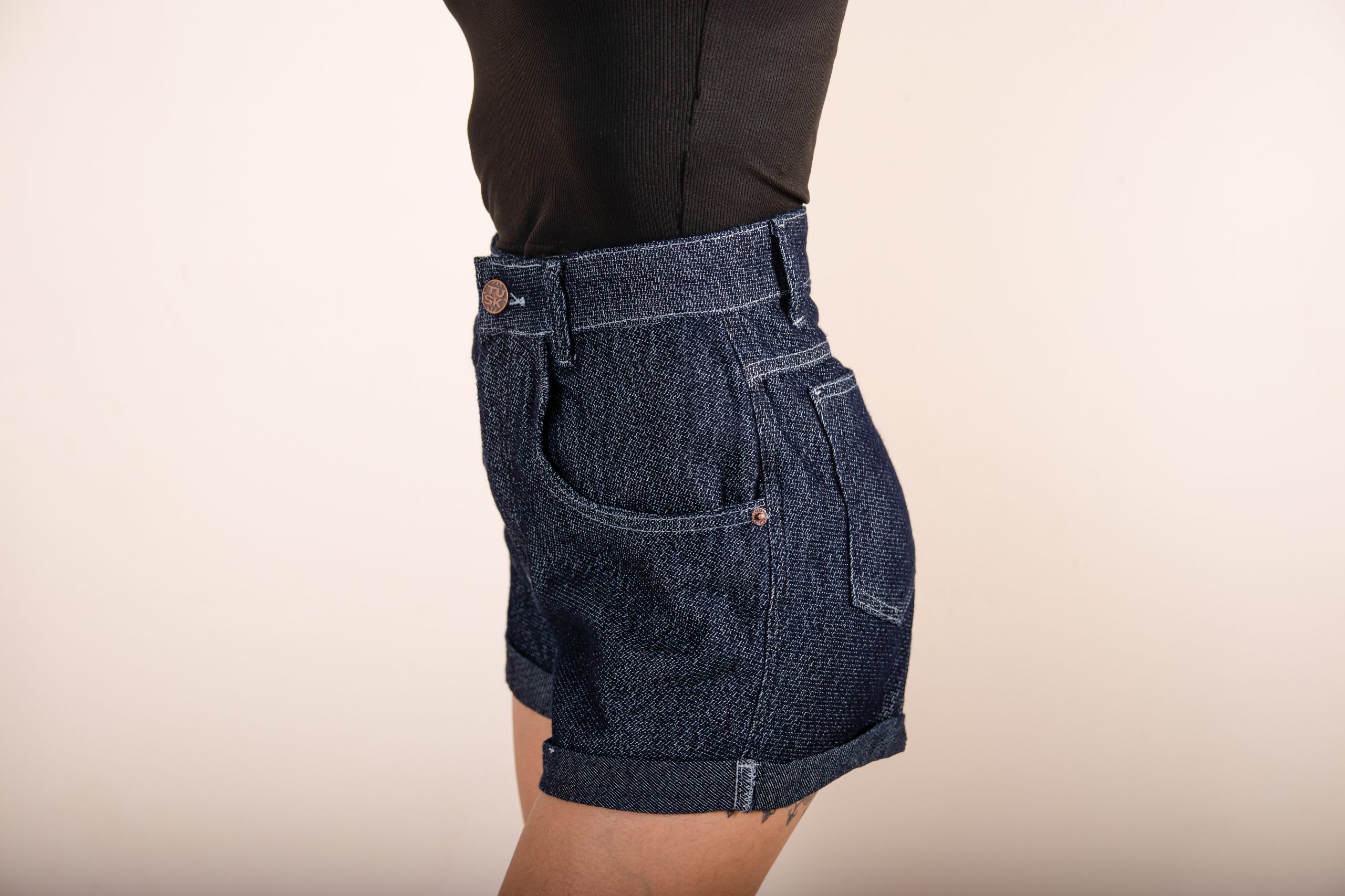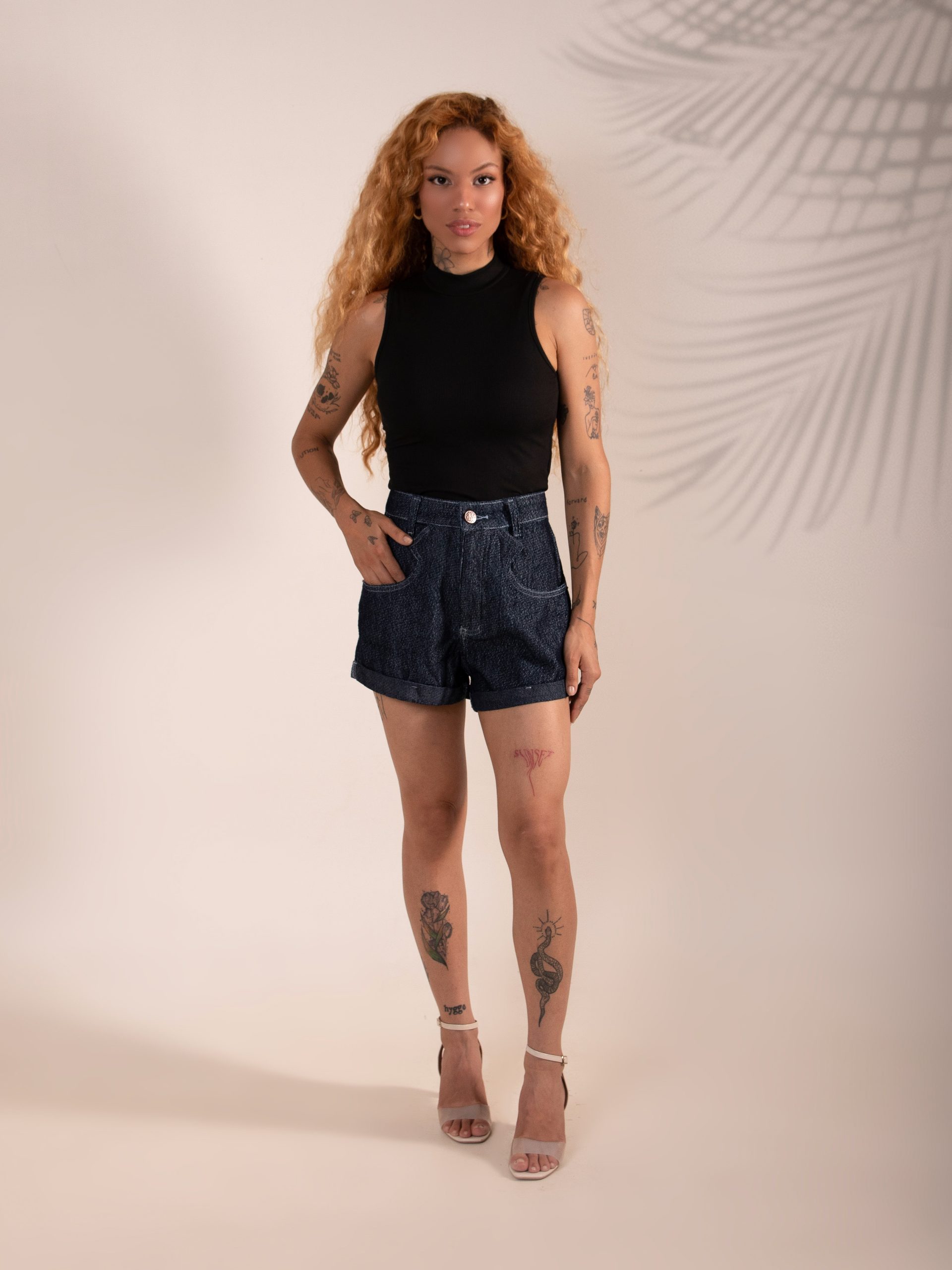 Short em tecido maquinetado, barra dobrada e detalhe no bolso da frente.